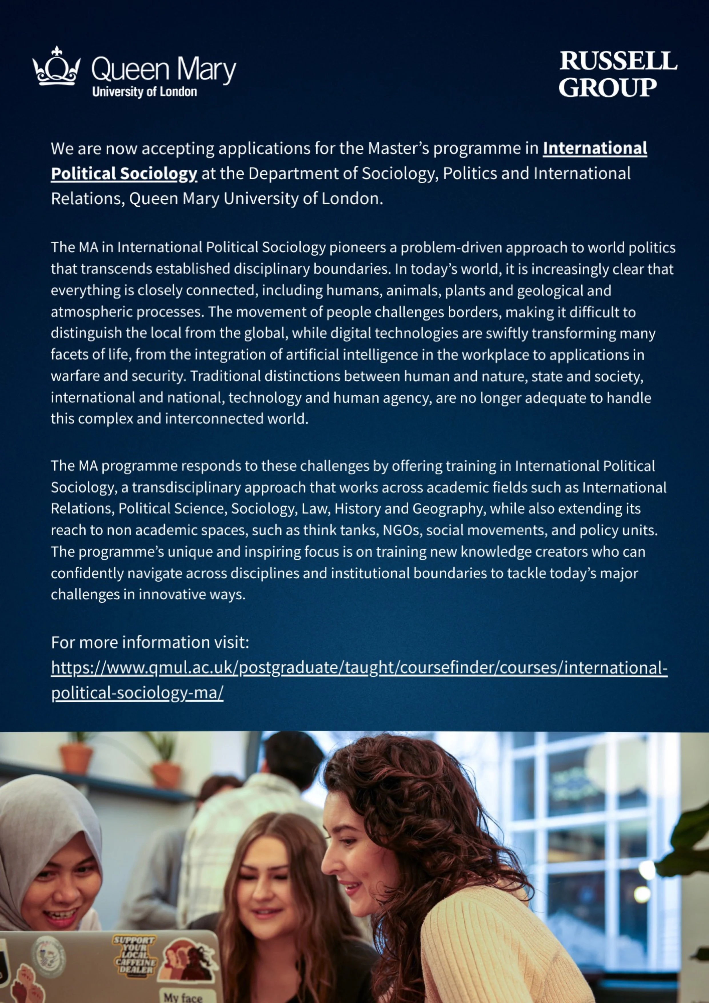 We are now accepting applications for the Master’s programme in International Political Sociology at the Department of Sociology, Politics and International Relations, Queen Mary University of London.